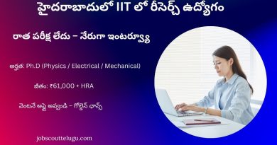 హైదరాబాద్‌లోని యూనివర్సిటీ ఆఫ్ హైదరాబాదు, ఫిజిక్స్ విభాగంలో రీసర్చ్ అసోసియేట్-2 (RA-II) పోస్టింగ్ కోసం అవకాశాన్ని అందిస్తోంది. ఈ ఉద్యోగంలో ప్రత్యేకమైన బెనిఫిట్స్ ఉన్నాయి – నేరుగా ఇంటర్వ్యూకు అవకాశం, ఎటువంటి రాత పరీక్ష అవసరం లేదు, మరియు డైరెక్ట్ జాయినింగ్ కూడా ఉంటుంది. ఉద్యోగం ప్రారంభంగా ఆరు నెలల కొరకు ఉంటుందీ, ప్రాజెక్ట్ ప్రగతి ప్రకారం పొడిగింపు సాధ్యమవుతుంది. అభ్యర్థులు ఫిజిక్స్ లేదా ఫోటోనిక్స్ సంబంధిత రంగాలలో Ph.D లేదా ME/M.Tech పూర్తిచేసి కనీసం 5 సంవత్సరాల అనుభవం కలిగి ఉండాలి. అభ్యర్థులు ఆన్‌లైన్ లేదా పోస్టల్ ద్వారా అప్లై చేయవచ్చు, కానీ పూర్తి వ్యవహారాలు హైదరాబాదు క్యాంపస్‌లో జరుగుతాయి. నెలవారీ ఫెలోషిప్ 61,000/- రూపాయలు, HRA 27% వరకు ఉంటుంది. ఈ గరిష్ట అవకాశాన్ని మిస్ కాకుండా వెంటనే అప్లై చేయండి, మీ కెరీర్‌లో కొత్త దశ ప్రారంభించండి!Hyderabad University Research Jobs 2025.
